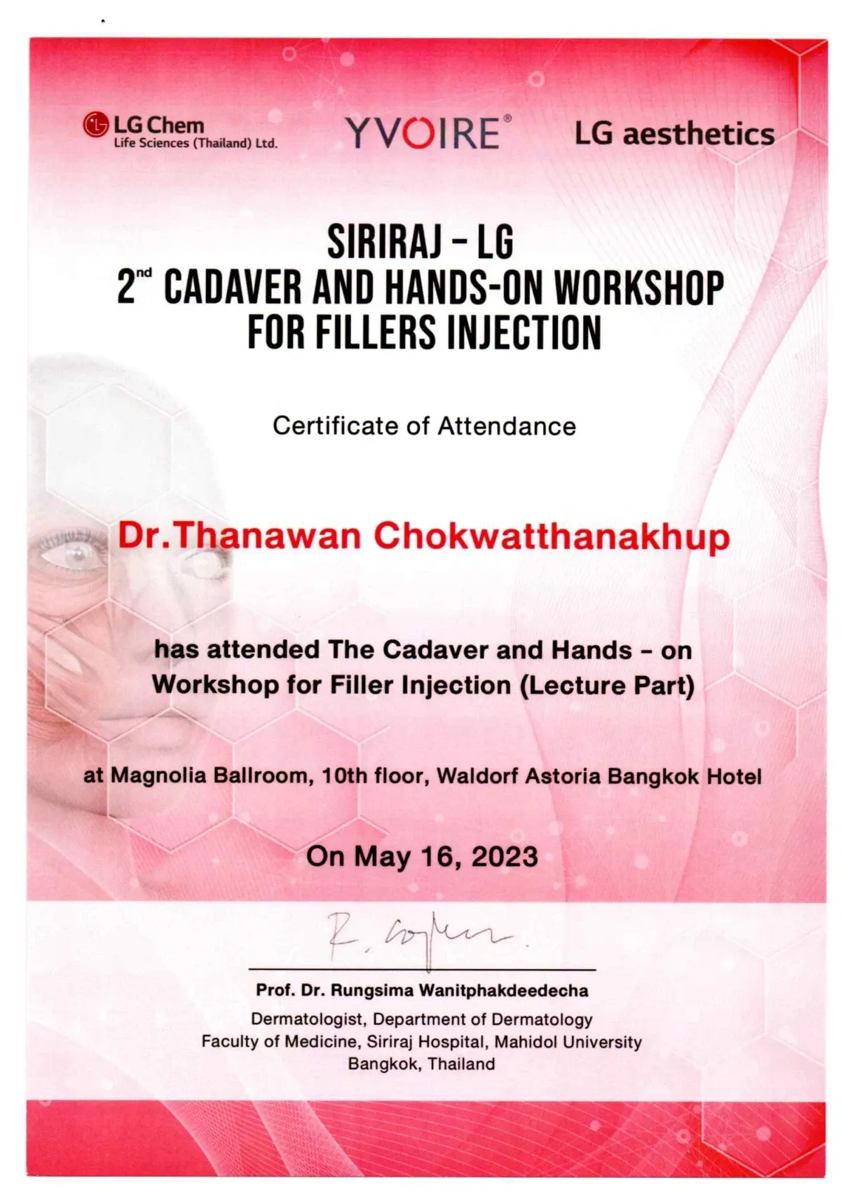 Certificate Siriraj - LG Cadaver And Hands-On Workshop For Fillers Injection, Bangkok, Thailand
