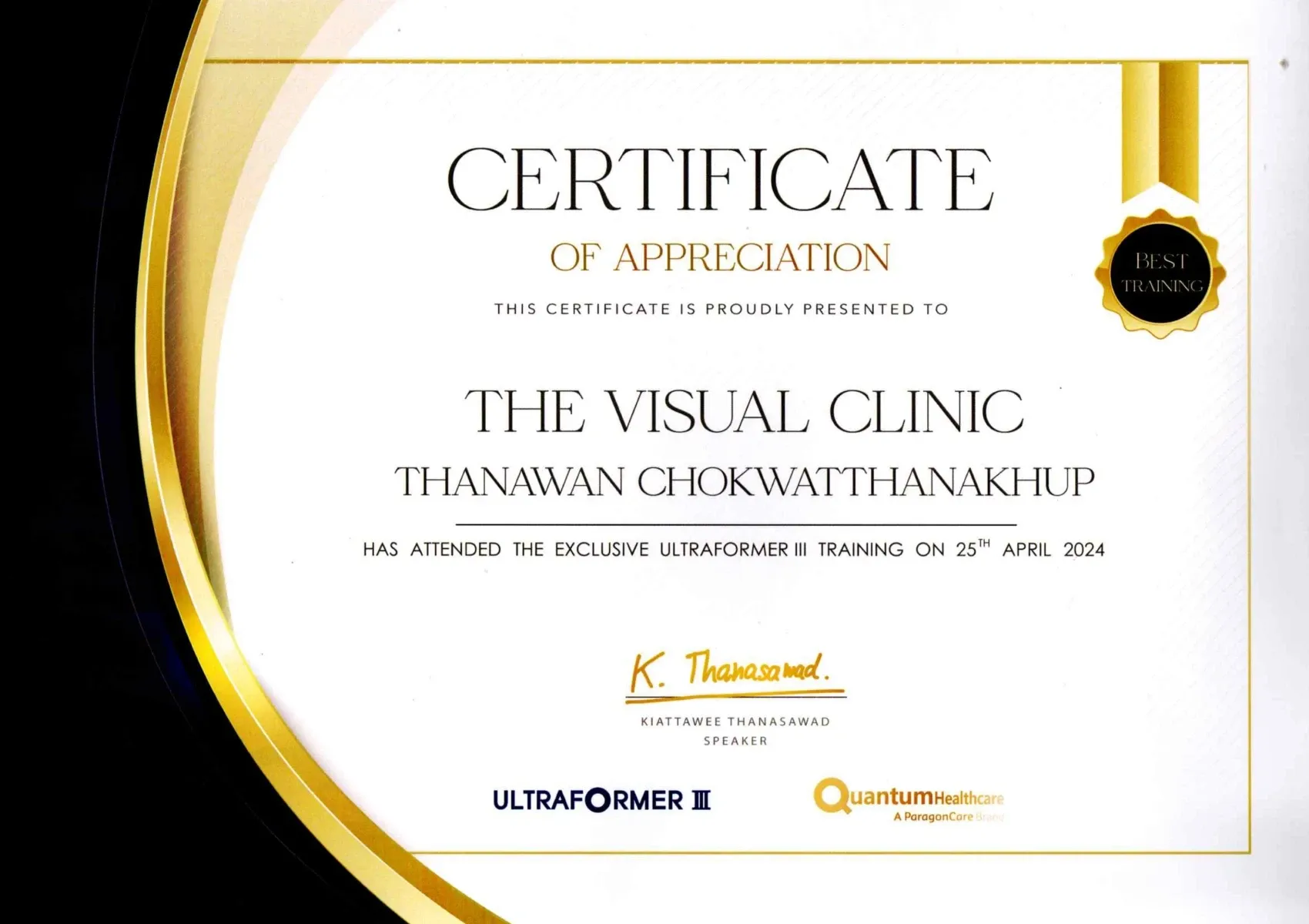 Certificate The Exclusive Ultraformer Ⅲ Training, Bangkok, Thailand