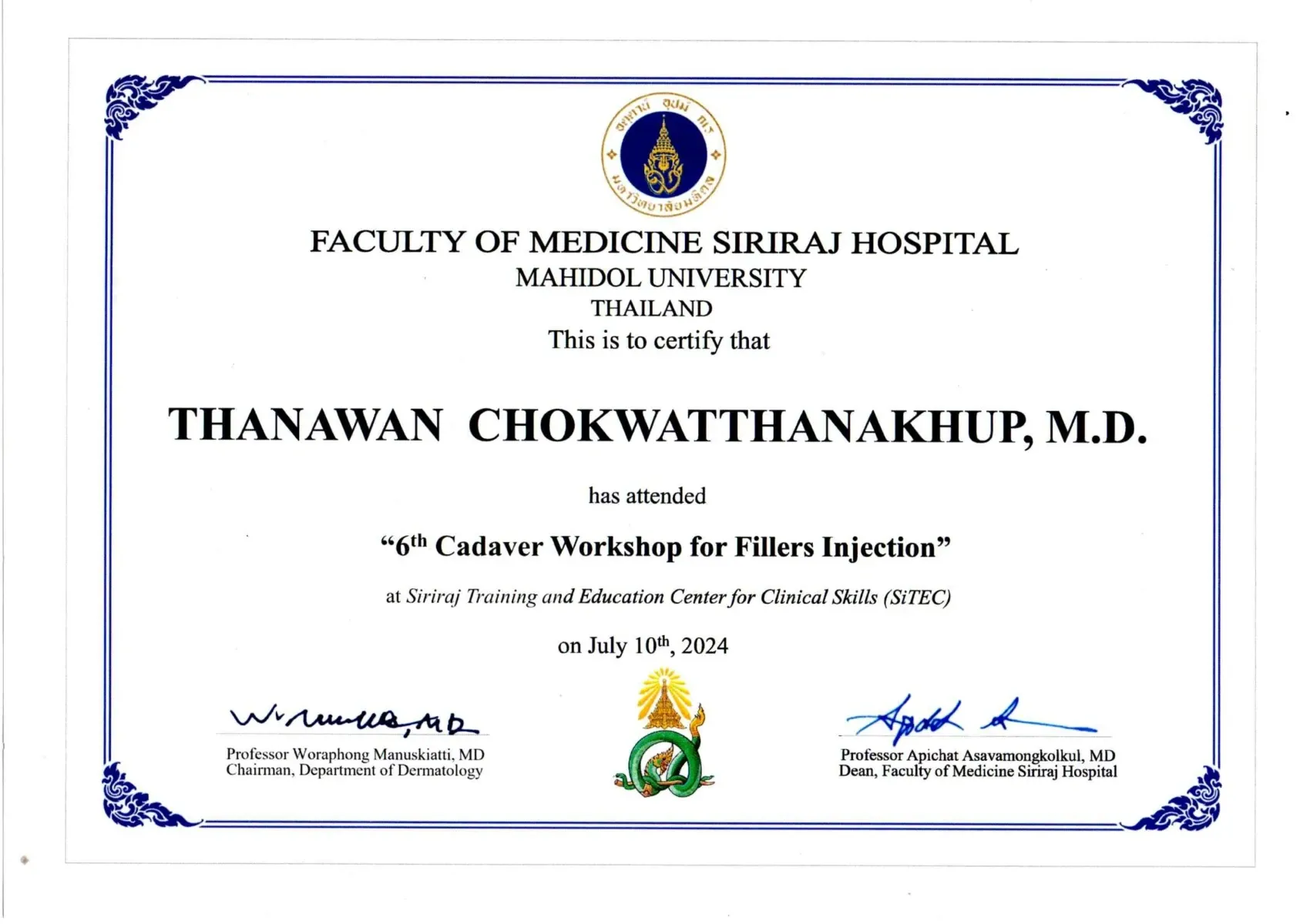 Certificate 6th Cadaver Workshop for Fillers Injection at Siriraj Training and Education Center for Clinical Skills (SiTEC), Bangkok, Thailand