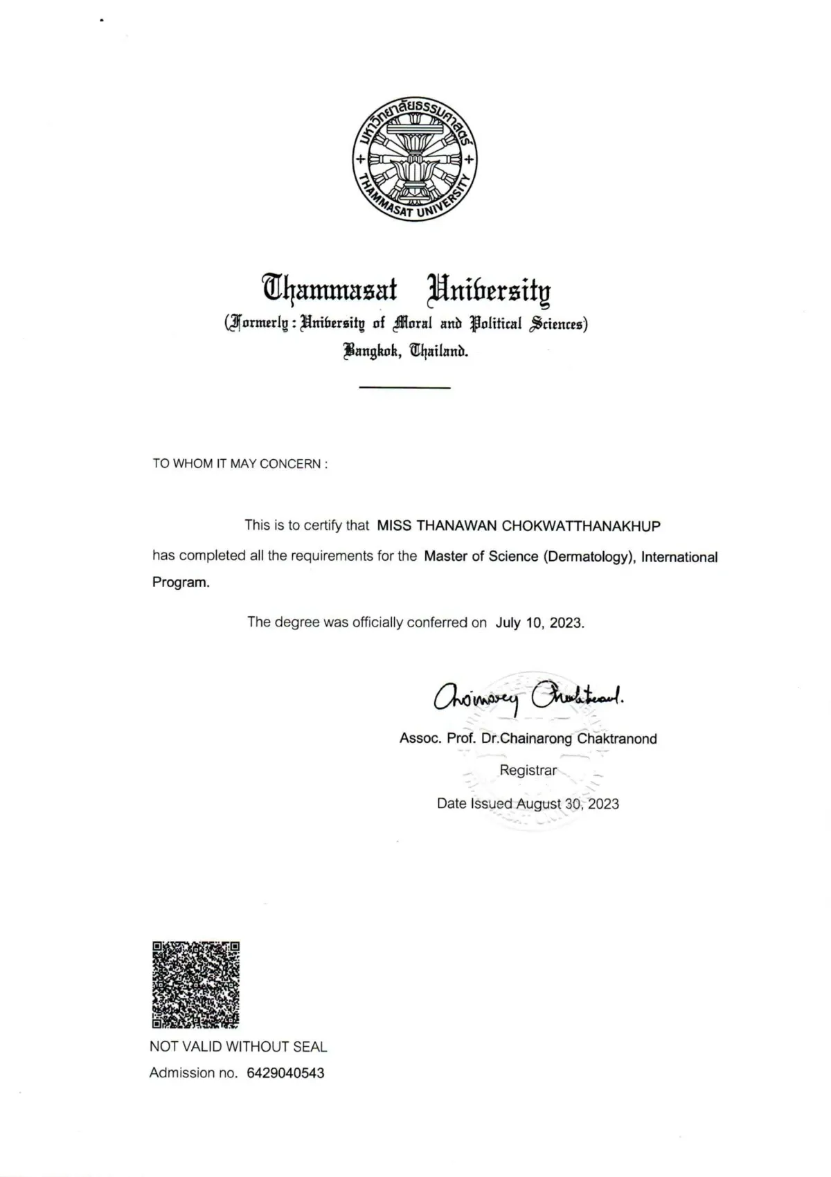 Master of Science in Dermatology, Chulabhorn International College of Medicine Thammasat University, Bangkok, Thailand