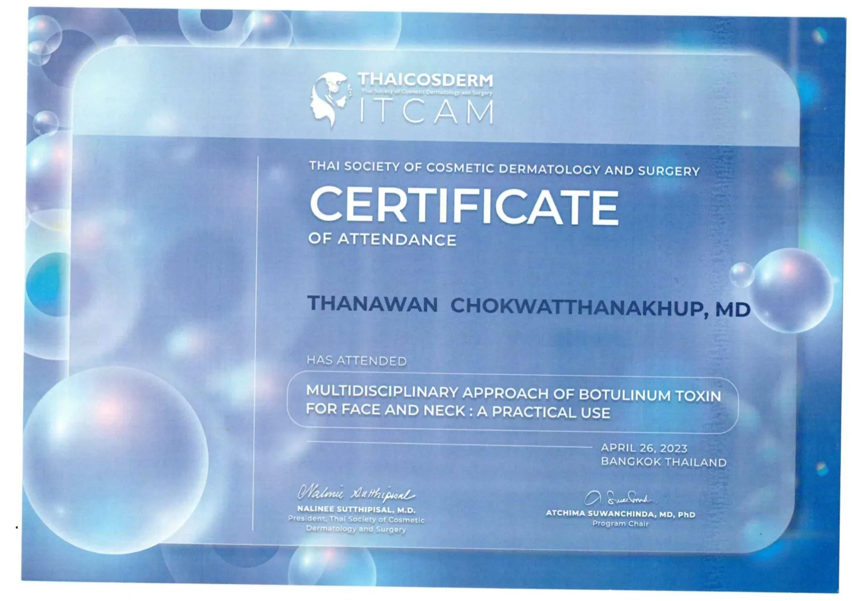 Certificate Multidisciplinary Approach of Botulinum Toxin for Face and Neck : A Practical Use, THAICOSDERM, Bangkok, Thailand