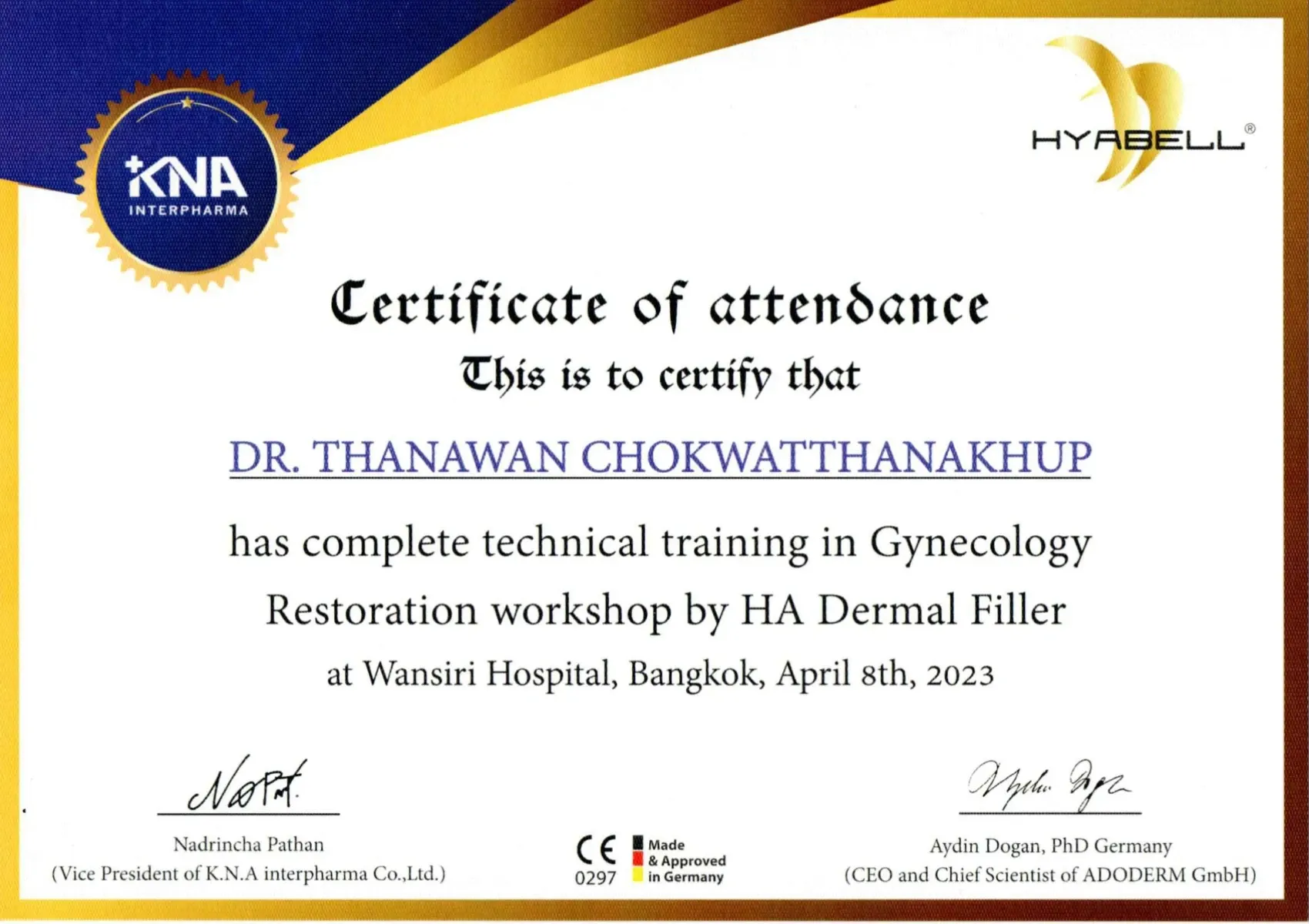 Certificate Technical Training in Gynecology Restoration workshop by HA Dermal Filler, KNA Interpharma, Bangkok, Thailand